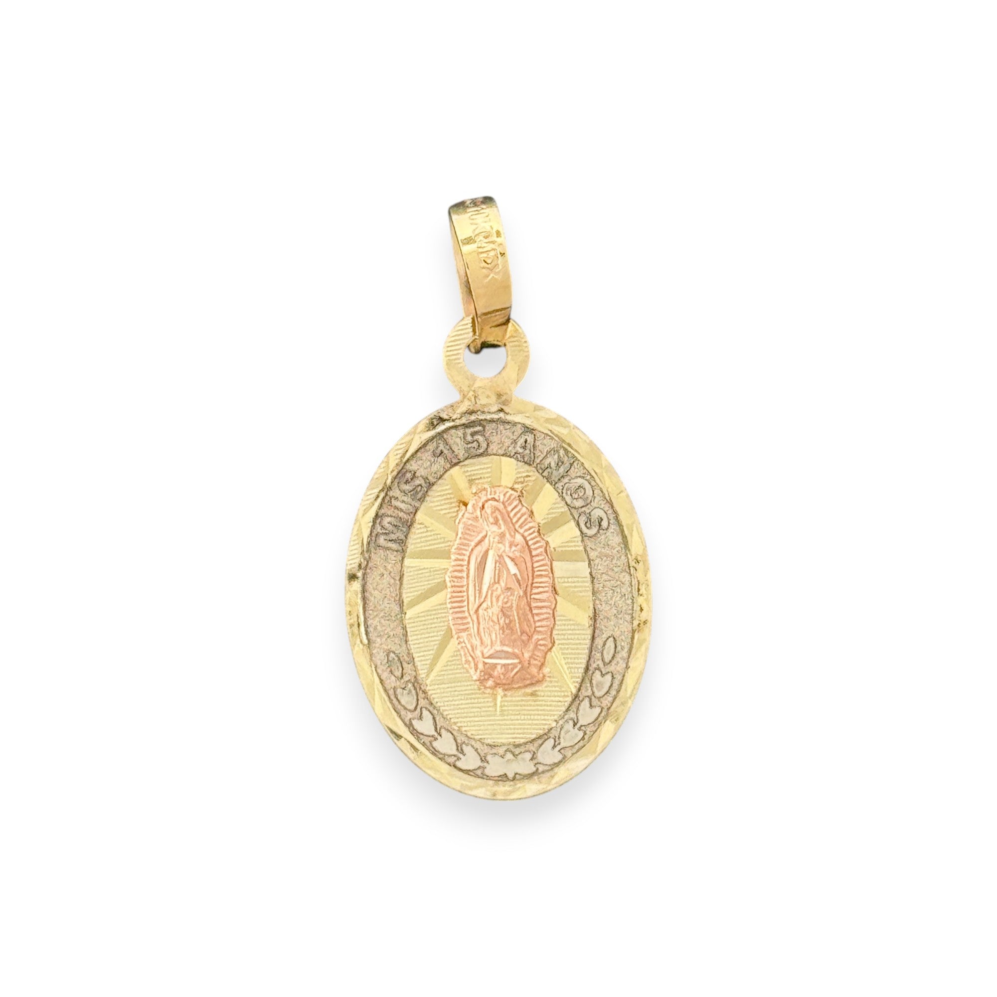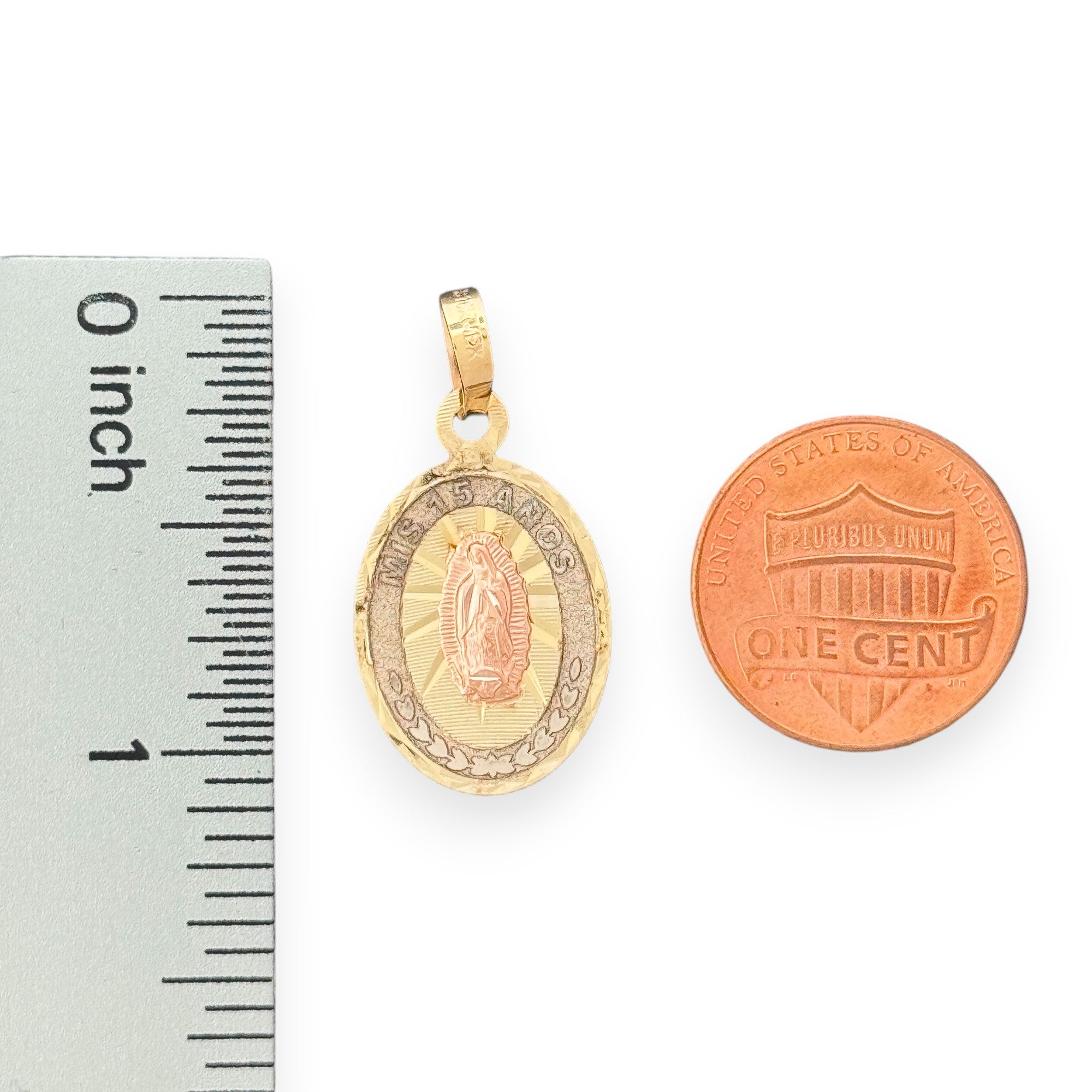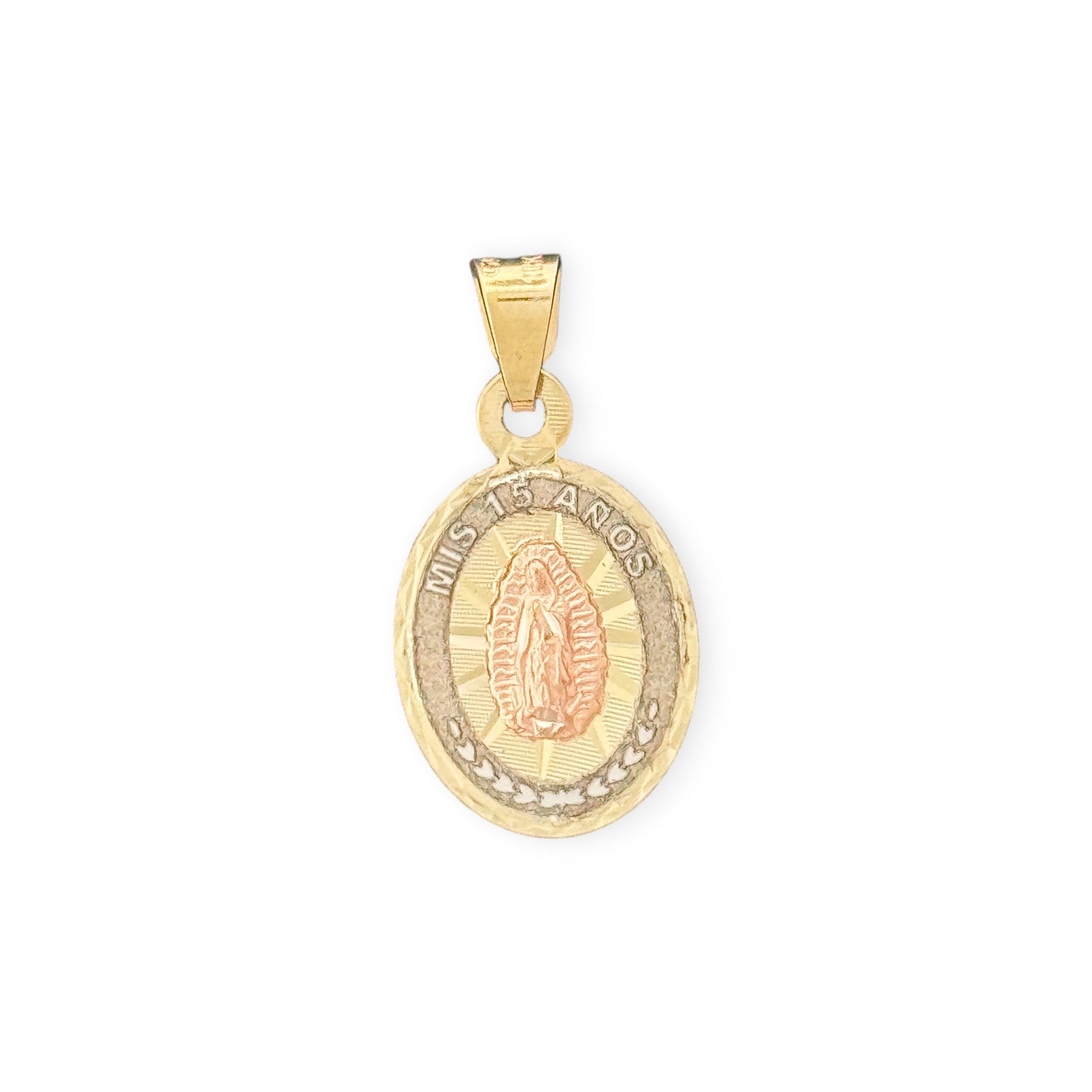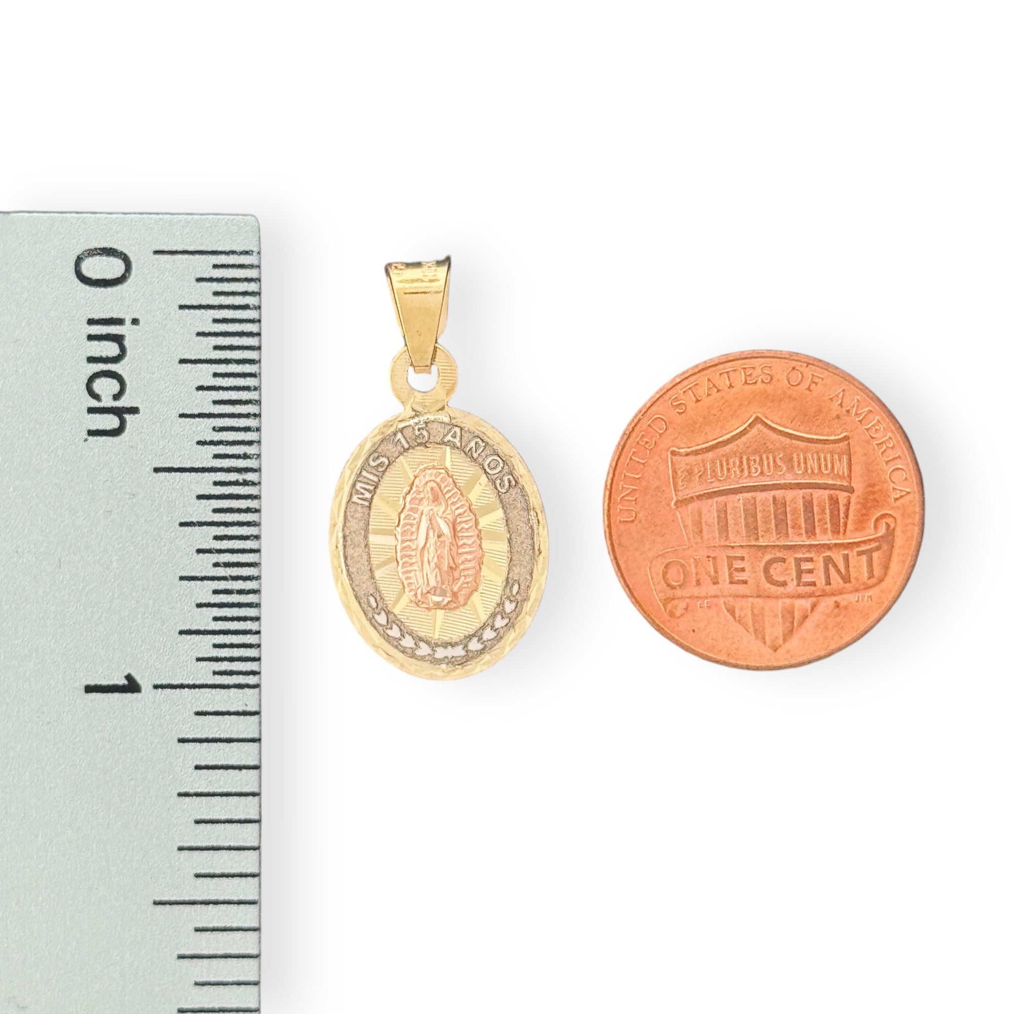 10KT Gold Oval "Mis 15 Años" Pendant with Virgin Mary, 1.9 Grm Login to see pricing