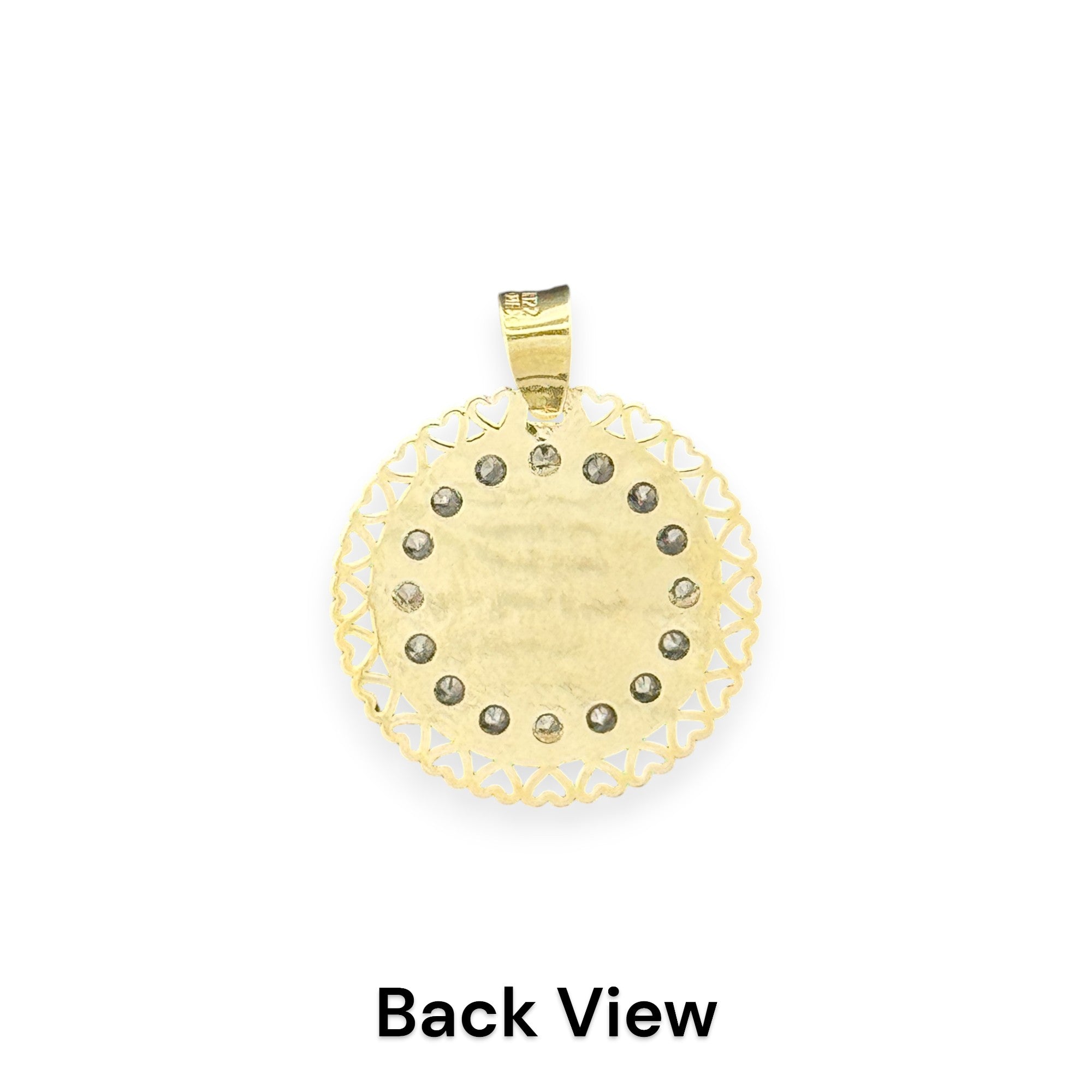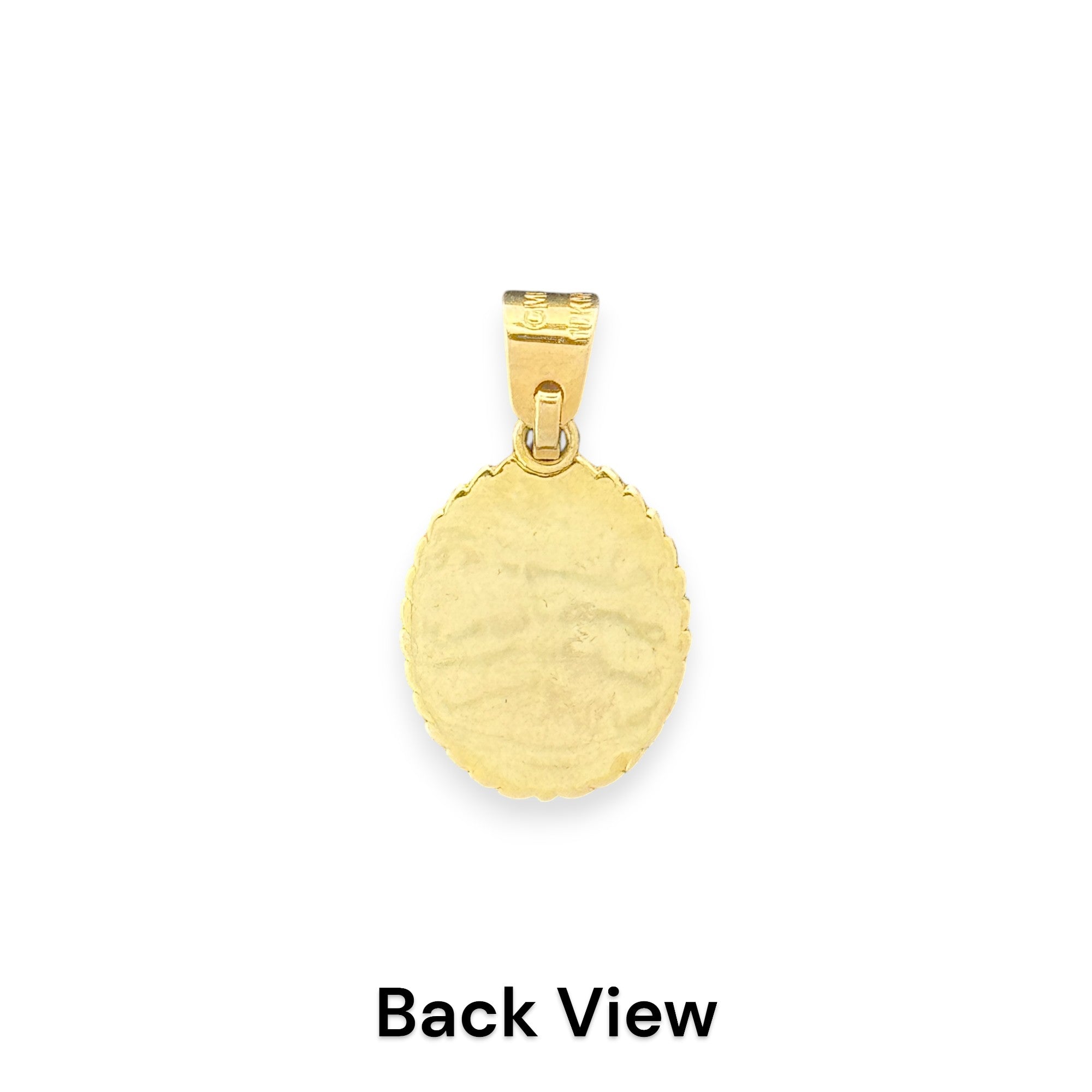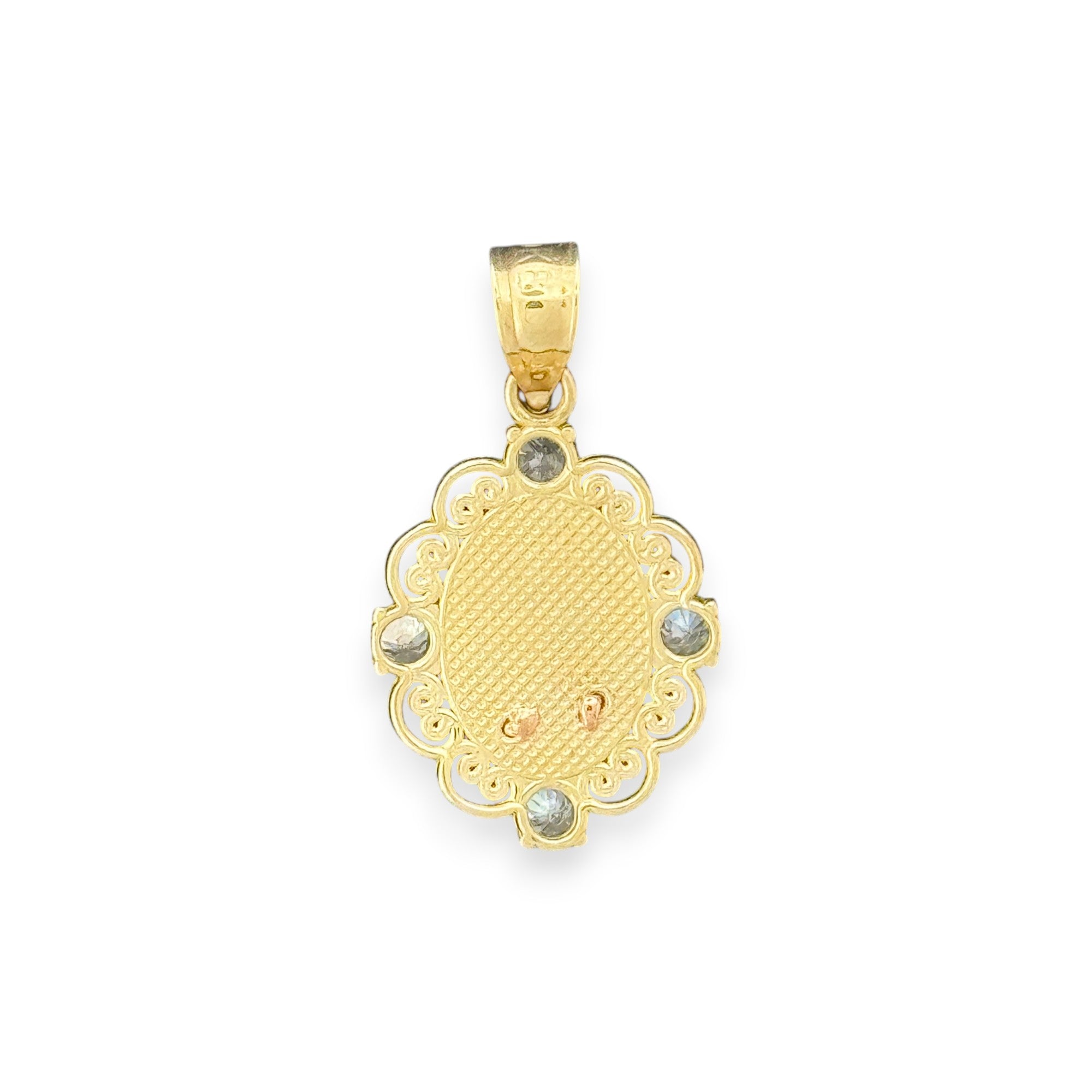10KT Gold Oval "Mis 15 Años" Pendant with Virgin Mary, 1.9 Grm Login to see pricing