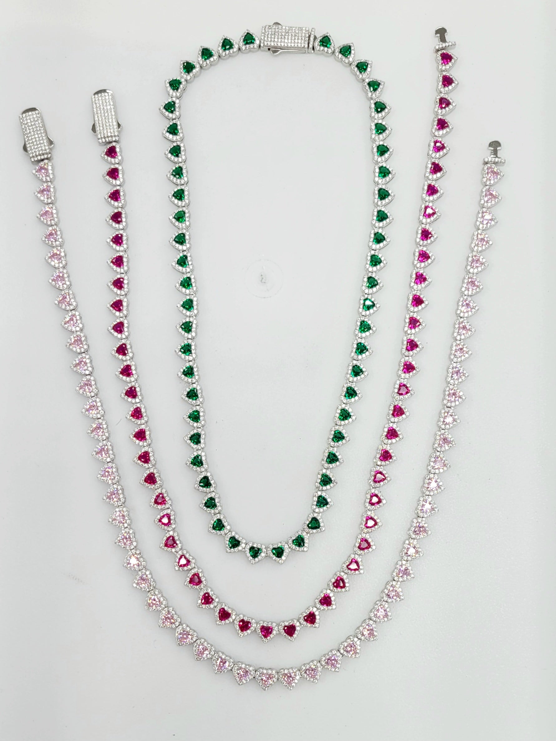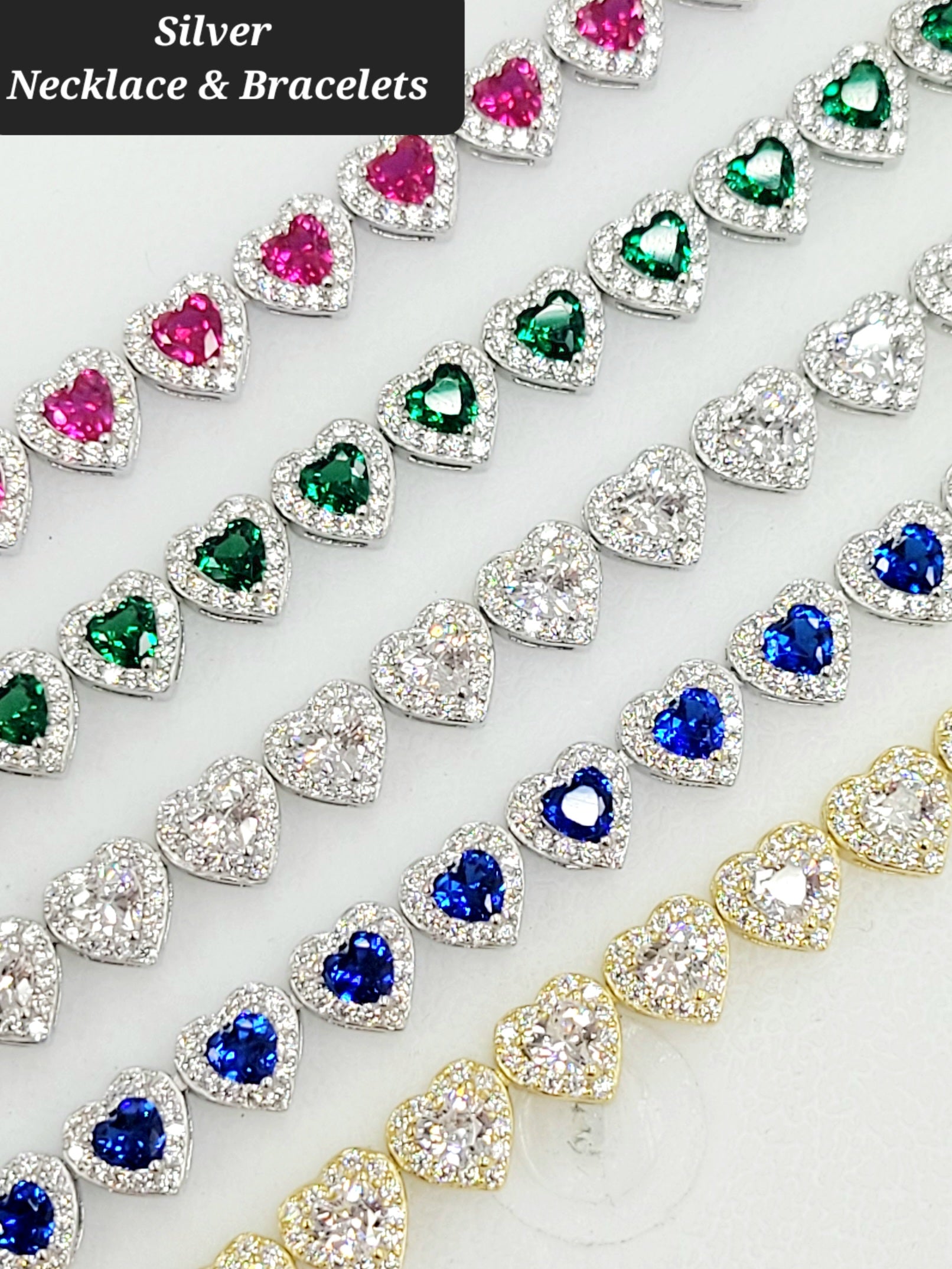 Add a touch of love and elegance with our 925 Sterling Silver Fancy Heart Bracelet and Necklace sets. Crafted from high-quality sterling silver and finished with luxurious rhodium-platinum plating, each piece sparkles while resisting tarnish. The vibrant colorful heart in pink, blue, green, and red bring playful charm and versatility, making them perfect for layering or gifting. Lightweight, durable, and hypoallergenic, these sets are ideal for daily wear or special occasions, adding a romantic and stylish statement to any outfit.