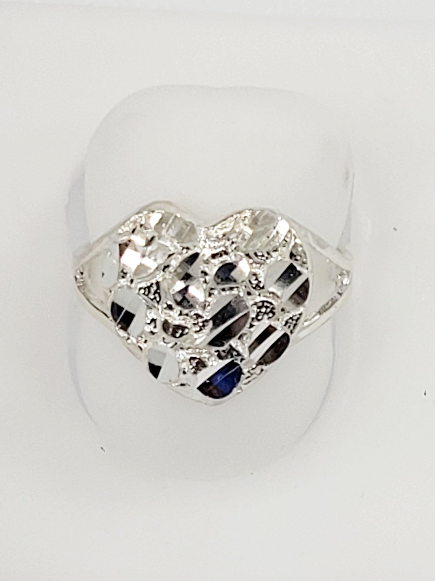 Crafted from authentic 925 sterling silver, this heart ring weight 2.0 grams features a distinctive nugget texture that catches light beautifully. The organic, hammered surface creates visual depth while the classic heart silhouette delivers timeless elegance. Perfect for layering or wearing solo, this piece combines artisanal craftsmanship with everyday wearability. An ideal choice for those who appreciate genuine silver jewelry with character and refined design.