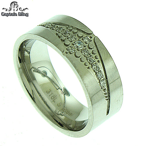 - Detailed Elements: Adorned with cubic zirconia stones arranged asymmetrically along the band.
